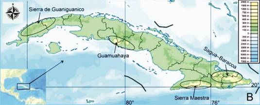 Cuba es un archipiélago compuesto por numerosas islas, una grande y estrecha (la más grande las de Antillas, con alrededor de 109 884 km2), la Isla de la Juventud (2419 km2) y un grupo de más de 4000 cayos e islotes (con un área total de alrededor de 3126 km2). Alrededor del 70 % de Cuba consiste en tierras llanas, con unas pocas sierras montañosas: en la región occidental la Sierra de Guaniguanico, en la región central Guamuahaya y en la región oriental la Sierra Maestra y Nipe–Sagua–Baracoa (Fig. 1).