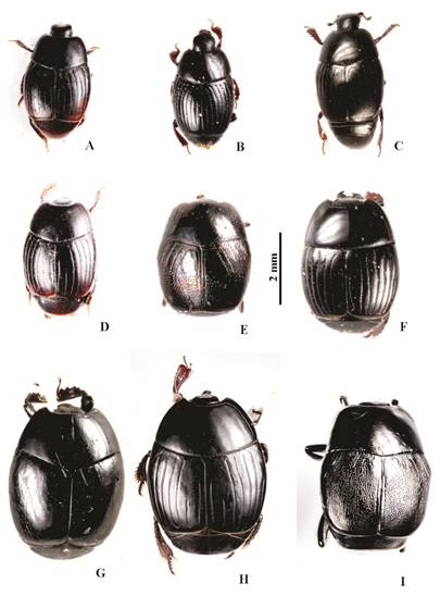 Figura 2. Vista dorsal de especies de interés criminalístico en Cuba. A) Phelister haemorrhous Marseul, 1854; B) Carcinops troglodytes (Paykull, 1811); C) Euspilotus arrogans (Marseul, 1855); D) Phelister panamensis LeConte, 1859; E) Xerosaprinus viator (Marseul, 1855); F) Atholus confinis (Erichson, 1834); G) Omalodes laevigatus (Quensel, 1806), H) Hister coenosus Erichson, 1834; I) Euspilotus cubaecola (Marseul, 1855).