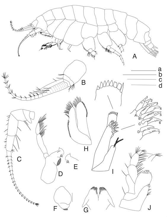 Figura 1. Pseudonesimus mariae sp. nov. hembra holotipo; A, vista lateral del holotipo; B, antena 1; C, antena 2; D, mandíbula derecha; E, mandíbula izquierda (borde cortante); F, labio superior; G, labio inferior; H, maxila 2; I, maxila 1 y J, maxilípedo. Escala: A: 1 mm; B-D: 0.5 mm.
