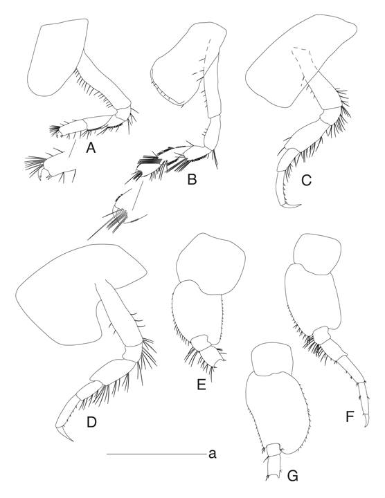 Figura 2. Pseudonesimus mariae, sp. nov.; A, gnatópodo 1; B, gnatópodo 2; C, pereópodo 3; D, pereópodo 4; E, pereópodo 5; F, pereópodo 6 y G, pereópodo 7. Escala: A-G: 1 mm.