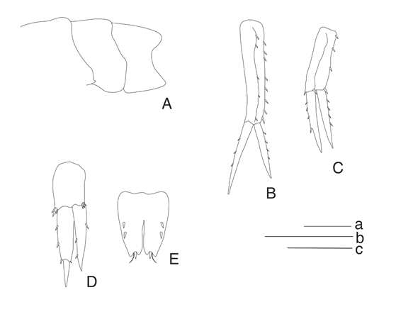 Figura 3. Pseudonesimus mariae, sp. nov.; A, epímeros; B, urópodo 1; C, urópodo 2; D, urópodo 3 y E, telson. Escala: A: 0.5 mm; B-C: 0.5 mm; D-E: 0.5 mm