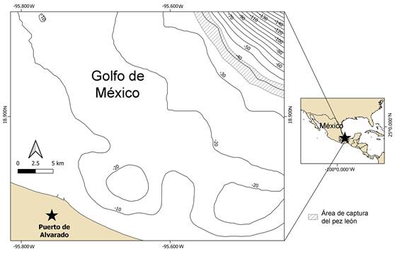 Figura 1. Mapa del área de captura del ejemplar del pez león, en la plataforma continental frente a Alvarado, Veracruz.