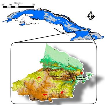 Cueva “La Campana” [21º08’27” N y 76º14’22” O], se localiza a 2 km al SO de Gibara (Fig. 1), provincia Holguín, nororiente de Cuba. Dicha cavidad se desarrolla en dos niveles, donde sus galerías y salones son bastante rectilíneos (espeleometría con 900 m de galerías cartografiados, ancho y desnivel promedio de 4 y 3 m, respectivamente). Sus galerías están excavadas en dos tipos de calizas: (1) Masivas, compactas y fuertemente organodetríticas [formación Gibara=Cretácico Inferior (Aptiano) – Cretácico Superior (Maestrichtiano Inferior)]; (2) biodetríticas, arcillosas, unidas a conglomerados calcáreos [formación Vázquez=Mioceno Inferior (parte alta) – Mioceno Medio] (Franco Álvarez et al., 2011).