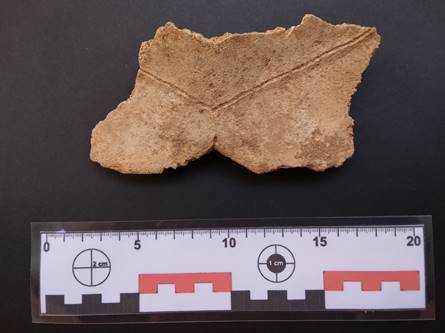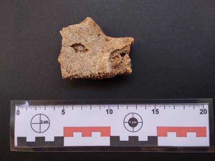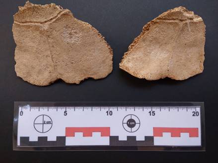 Figura 5. Fragmento del xifiplastron de Chelonoidis cubensis, LMR-R-209 (vista ventral), recolectado en cueva La Campana, Gibara.