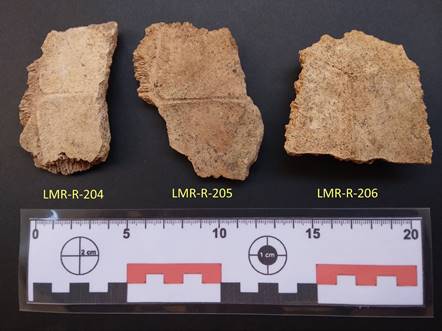 Figura 4. Fragmentos de elementos plastrales de Chelonoidis cubensis, LMR-R-204 a LMR-R-206 (vista ventral), recolectados en cueva La Campana, Gibara.